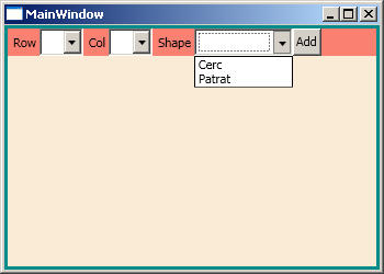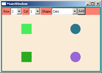 public partial class MainWindow : Window { Grid grid; ComboBox cb_r, cb_c, cb_shapes; double shapeW = 35; double shapeH = 35; Random rnd = new Random(); public MainWindow() { InitializeComponent(); this.Content = null; AddContent(); } public void AddContent() { Border b = new Border(); //un nou contur b.BorderThickness = new Thickness(3); //grosimea liniei b.BorderBrush = new SolidColorBrush(Colors.DarkCyan); //culoarea liniei DockPanel dp = new DockPanel(); dp.Background = new SolidColorBrush(Colors.AliceBlue); StackPanel sp = new StackPanel(); sp.Background = new SolidColorBrush(Colors.Salmon); sp.Orientation = Orientation.Horizontal; sp.SetValue(DockPanel.DockProperty, Dock.Top); //se seteaza proprietatea Dock, de tip DependencyProperty sp.Height = 25; grid = new Grid(); grid.Background = new SolidColorBrush(Colors.AntiqueWhite); grid.RowDefinitions.Add(new RowDefinition()); //se definesc randurile grid.RowDefinitions.Add(new RowDefinition()); grid.ColumnDefinitions.Add(new ColumnDefinition()); //si coloanele grid.ColumnDefinitions.Add(new ColumnDefinition()); TextBlock tb_r = new TextBlock(); tb_r.Text = "Row"; tb_r.Margin = new Thickness(5, 0, 3, 0); TextBlock tb_c = new TextBlock(); tb_c.Text = "Col"; tb_c.Margin = new Thickness(5, 0, 3, 0); //am definit textul tb_c.VerticalAlignment = tb_r.VerticalAlignment = System.Windows.VerticalAlignment.Center; cb_r = new ComboBox(); cb_c = new ComboBox(); cb_c.Width = cb_r.Width = 40; for (int i = 0; i < grid.RowDefinitions.Count; i++) cb_r.Items.Add(new ComboBoxItem().Content = i); for (int i = 0; i < grid.ColumnDefinitions.Count; i++) cb_c.Items.Add(new ComboBoxItem().Content = i); TextBlock tb_shape = new TextBlock(); tb_shape.VerticalAlignment = System.Windows.VerticalAlignment.Center; tb_shape.Text = "Shape"; tb_shape.Margin = new Thickness(5, 0, 3, 0); cb_shapes = new ComboBox(); cb_shapes.Width = 90; cb_shapes.Items.Add(new ComboBoxItem().Content = "Cerc"); cb_shapes.Items.Add(new ComboBoxItem().Content = "Patrat"); Button btnAdd = new Button(); btnAdd.Content = "Add"; btnAdd.Click += new RoutedEventHandler(btnAdd_Click); sp.Children.Add(tb_r); sp.Children.Add(cb_r); sp.Children.Add(tb_c); sp.Children.Add(cb_c); sp.Children.Add(tb_shape); sp.Children.Add(cb_shapes); sp.Children.Add(btnAdd); // Panoul de comanda: dp.Children.Add(sp); //elementul dockPanel primeste un elemetn copil: StackPanel dp.Children.Add(grid); //elementul dockPanel primeste un elemetn copil: Grid b.Child = dp; //conturului i se stabileste elementul copil this.AddChild(b); } void btnAdd_Click(object sender, RoutedEventArgs e) { if (cb_shapes.SelectedItem == null) { MessageBox.Show("Pentru a desena, selectati o forma geometrica."); return; } Shape s; //voi crea forma geometrica in functie de selectia utilizatorului if (cb_shapes.SelectedItem.ToString().ToLower() == "cerc") s = new Ellipse(); else s = new Rectangle(); s.Width = shapeW; s.Height = shapeH; s.Fill = new SolidColorBrush(Color.FromRgb((byte)rnd.Next(0, 256), (byte)rnd.Next(0, 256), (byte)rnd.Next(0, 256))); int row = cb_r.SelectedItem == null ? 0 : (int)cb_r.SelectedItem; int col = cb_c.SelectedItem == null ? 0 : (int)cb_c.SelectedItem; s.SetValue(Grid.ColumnProperty, col); s.SetValue(Grid.RowProperty, row); grid.Children.Add(s); } }