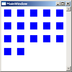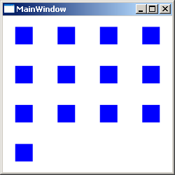 <Window x:Class="Conatainers.MainWindow" xmlns="http://schemas.microsoft.com/winfx/2006/xaml/presentation" xmlns:x="http://schemas.microsoft.com/winfx/2006/xaml" Title="MainWindow" Height="250" Width="250"> <UniformGrid> <Rectangle Fill="Blue" Width="25" Height="25"/> <Rectangle Fill="Blue" Width="25" Height="25"/> <Rectangle Fill="Blue" Width="25" Height="25"/> <Rectangle Fill="Blue" Width="25" Height="25"/> <Rectangle Fill="Blue" Width="25" Height="25"/> <Rectangle Fill="Blue" Width="25" Height="25"/> <Rectangle Fill="Blue" Width="25" Height="25"/> <Rectangle Fill="Blue" Width="25" Height="25"/> <Rectangle Fill="Blue" Width="25" Height="25"/> <Rectangle Fill="Blue" Width="25" Height="25"/> <Rectangle Fill="Blue" Width="25" Height="25"/> <Rectangle Fill="Blue" Width="25" Height="25"/> <Rectangle Fill="Blue" Width="25" Height="25"/> </UniformGrid> </Window>