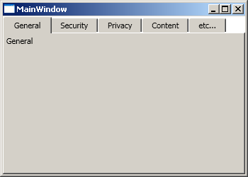 <Window x:Class="Conatainers.MainWindow" xmlns="http://schemas.microsoft.com/winfx/2006/xaml/presentation" xmlns:x="http://schemas.microsoft.com/winfx/2006/xaml" Title="MainWindow" Height="250" Width="350"> <TabControl> <TabItem Header="General">General</TabItem> <TabItem Header="Security">Security</TabItem> <TabItem Header="Privacy">Privacy</TabItem> <TabItem Header="Content">Content</TabItem> <TabItem Header="etc...">etc...</TabItem> </TabControl> </Window>