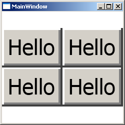 <Window x:Class="Conatainers.MainWindow" xmlns="http://schemas.microsoft.com/winfx/2006/xaml/presentation" xmlns:x="http://schemas.microsoft.com/winfx/2006/xaml" Title="MainWindow" Height="250" Width="250"> <Viewbox> <UniformGrid> <Button>Hello</Button> <Button>Hello</Button> <Button>Hello</Button> <Button>Hello</Button> </UniformGrid> </Window>