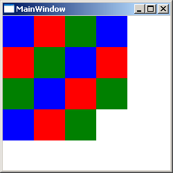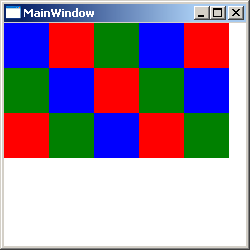 <Window x:Class="Conatainers.MainWindow" xmlns="http://schemas.microsoft.com/winfx/2006/xaml/presentation" xmlns:x="http://schemas.microsoft.com/winfx/2006/xaml" Title="MainWindow" Height="250" Width="250"> <WrapPanel> <Rectangle Fill="Blue" Width="45" Height="45"/> <Rectangle Fill="Red" Width="45" Height="45"/> <Rectangle Fill="Green" Width="45" Height="45"/> <Rectangle Fill="Blue" Width="45" Height="45"/> <Rectangle Fill="Red" Width="45" Height="45"/> <Rectangle Fill="Green" Width="45" Height="45"/> <Rectangle Fill="Blue" Width="45" Height="45"/> <Rectangle Fill="Red" Width="45" Height="45"/> <Rectangle Fill="Green" Width="45" Height="45"/> <Rectangle Fill="Blue" Width="45" Height="45"/> <Rectangle Fill="Red" Width="45" Height="45"/> <Rectangle Fill="Green" Width="45" Height="45"/> <Rectangle Fill="Blue" Width="45" Height="45"/> <Rectangle Fill="Red" Width="45" Height="45"/> <Rectangle Fill="Green" Width="45" Height="45"/> </WrapPanel> </Window>