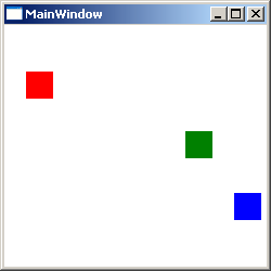 <Window x:Class="Conatainers.MainWindow" xmlns="http://schemas.microsoft.com/winfx/2006/xaml/presentation" xmlns:x="http://schemas.microsoft.com/winfx/2006/xaml" Title="MainWindow" Height="250" Width="250"> <Canvas> <Rectangle Fill="Blue" Width="25" Height="25" Canvas.Top="155" Canvas.Right="5"/> <Rectangle Fill="Red" Width="25" Height="25" Canvas.Bottom="155" Canvas.Left="20"/> <Rectangle Fill="Green" Width="25" Height="25" Canvas.Bottom="100" Canvas.Right="50"/> </Canvas> </Window>