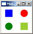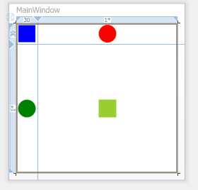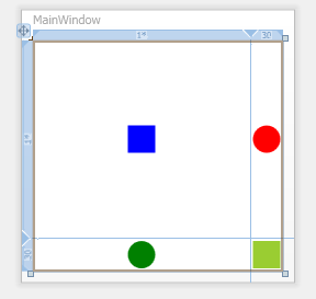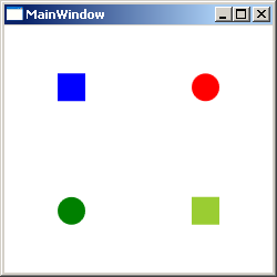 <Window x:Class="Conatainers.MainWindow" xmlns="http://schemas.microsoft.com/winfx/2006/xaml/presentation" xmlns:x="http://schemas.microsoft.com/winfx/2006/xaml" Title="MainWindow" Height="250" Width="250"> <Grid> <Grid.RowDefinitions> <RowDefinition /> <RowDefinition /> </Grid.RowDefinitions> <Grid.ColumnDefinitions> <ColumnDefinition/> <ColumnDefinition/> </Grid.ColumnDefinitions> <Rectangle Fill="Blue" Width="25" Height="25"/> <Ellipse Fill="Green" Width="25" Height="25" Grid.Column="0" Grid.Row="1"/> <Ellipse Fill="Red" Width="25" Height="25" Grid.Column="1" Grid.Row="0"/> <Rectangle Fill="YellowGreen" Width="25" Height="25" Grid.Column="1" Grid.Row="1"/> </Grid> </Window>