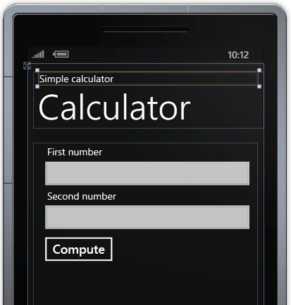 <!--TitlePanel contains the name of the application and page title--> <StackPanel x:Name="TitlePanel" Grid.Row="0" Margin="12,17,0,28"> <TextBlock x:Name="ApplicationTitle" Text="Simple calculator" Style="{StaticResource PhoneTextNormalStyle}" /> <TextBlock x:Name="PageTitle" Text="Calculator" Margin="9,-7,0,0" Style="{StaticResource PhoneTextTitle1Style}"/> </StackPanel>
